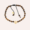 This stylish Talisman is a 13mm Khandha charm in sterling silver with 22K gold vermeil with cubic zirconia. Hand knotted in Tigers Eye with black cord . The macrame tie is adjustable to fit wrist Size M to L for guys or gals.