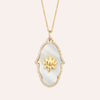 Symbols are considered the earliest forms of communication, the Sohavi mother of pearl Lotus hand necklace is a modern Talisman . In Hinduism and Buddhism the Hamsa represents the energy chakras, that flow through the body and connect with the five senses it felt appropriate to place a lotus flower in the centre of a contemporary style Hamsa which represents the heart centre, purity and protection of God, edged with sparkly micro pave cubic zirconia.
