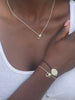 Perfect for layering, our dainty sterling silver Om necklace in a stylish fine cable chain has a cubic zirconia set at the top with a discreet hanging loop behind the symbol so that when worn it looks like it’s floating; wear near the sternum 16 inches or lower at 18 inches.