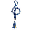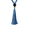 108 8mm Blue Lapis precious stones with hand dyed black Rudraksha Guru Bead. It has long luxurious silky cotton tassel with gold metallic zari thread flowing through it and a hand dyed black Rudraksha guru bead.