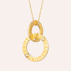 This 22K gold vermeil necklace has two rings which are entwined into each other, significantly called the Infinity pendant . The mantra featured on the top ring is Satnam describing the essence of divine eternal truth, with reference to Gods infinite true nature and the lower ring has the mantra Waheguru which means wow, oh wondrous universes. The mantra is featured on both front and reverse of each ring, as is the cubic zirconia so when worn you don't have to worry about turning it to the front.